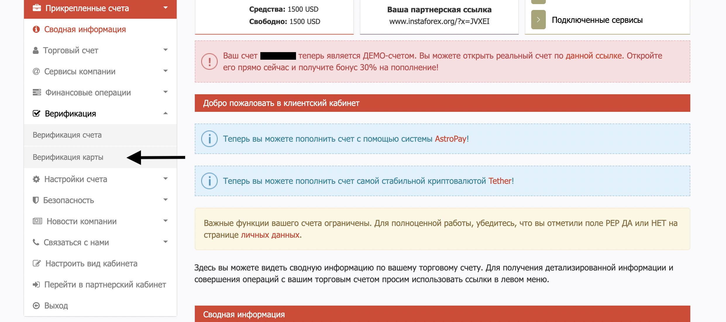 Будь ласка, увійдіть в кабінет клієнта свого торгового рахунку, в лівому меню виберіть Верифікація, потім "Верифікація карти". На сторінці, ви зможете завантажити фото лицьового та зворотного боків карти. Зверніть увагу на необхідність приховування сенситивних даних на фотографіях.