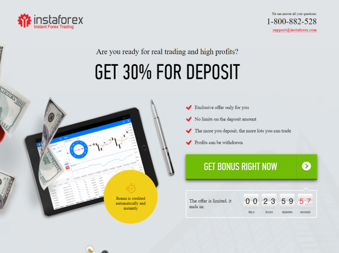 Offre lucrative exclusivement pour les clients d’InstaForex. Alimentez votre compte de trading et obtenez +30% sur votre dépôt. Un dépôt plus élevé donne l’opportunité de faire des échanges d’un volume plus important. Le bonus est fourni instantanément pour tout dépôt, sans limites.