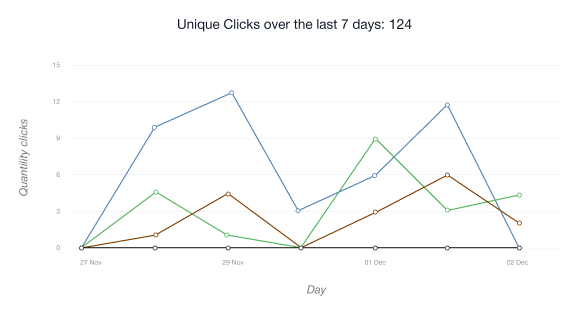 • Le graphique des Clics Uniques montre le nombre d’utilisateurs qui ont suivi votre lien d’affiliation pour la première fois depuis la même adresse IP au cours des dernières 24 heures.